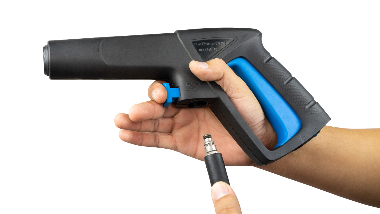 ปืนเป็นรูปแบบ Quick Conect สะดวกในการต่อใช้งาน เพียงแค่เสียบล็อค